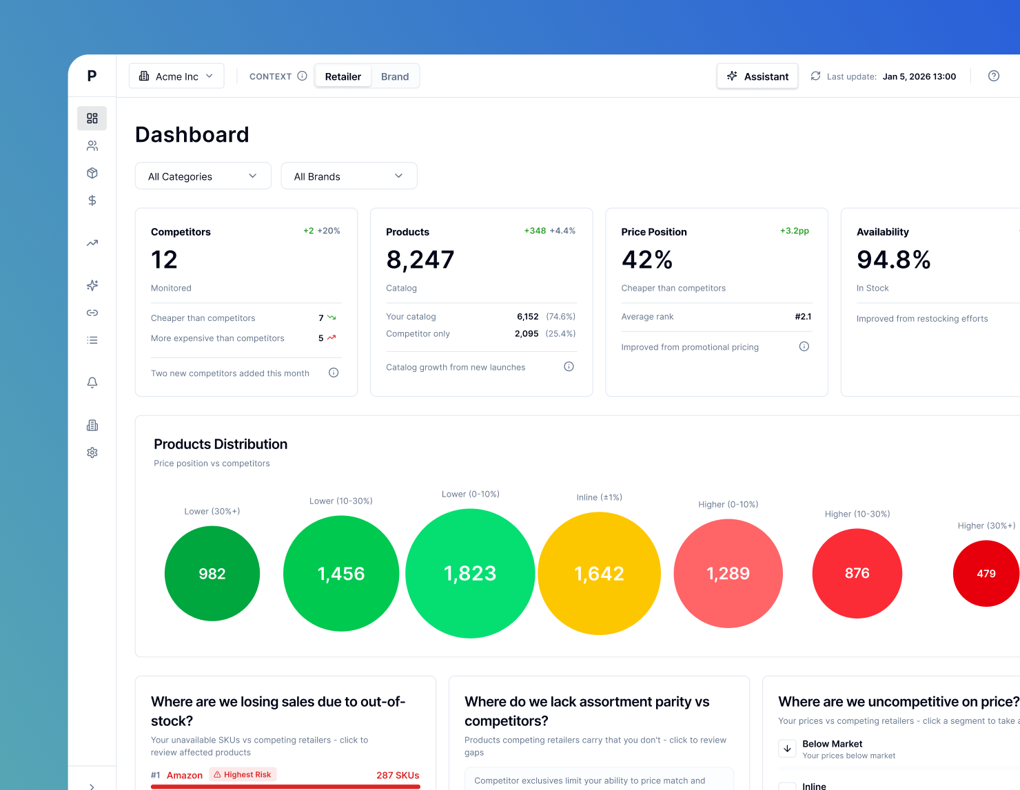 Retailer: See pricing competitiveness, margin impact, and market position.